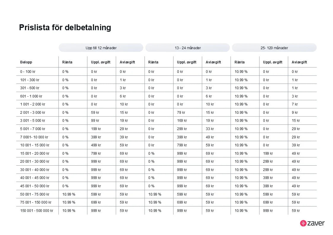Betalningsalternativet heter i kassan: Faktura 14 dagar eller Delbetalning (Räntefri upp till 50 000kr 24mån)Handla nu och betala senare med Zaver. Du kan välja att betala direkt med banköverföring, betala senare med 14 dagars faktura eller dela upp din betalning.