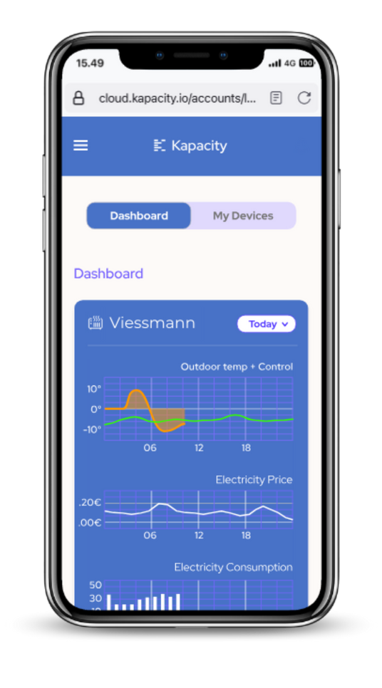 Börja med att registrera ett användarkonto på Kapacity.io. För att ansluta din värmepump mot den smarta värmepumpskontrollen klickar du på ”Add device” i applikationen och väljer din enhetstillverkare.