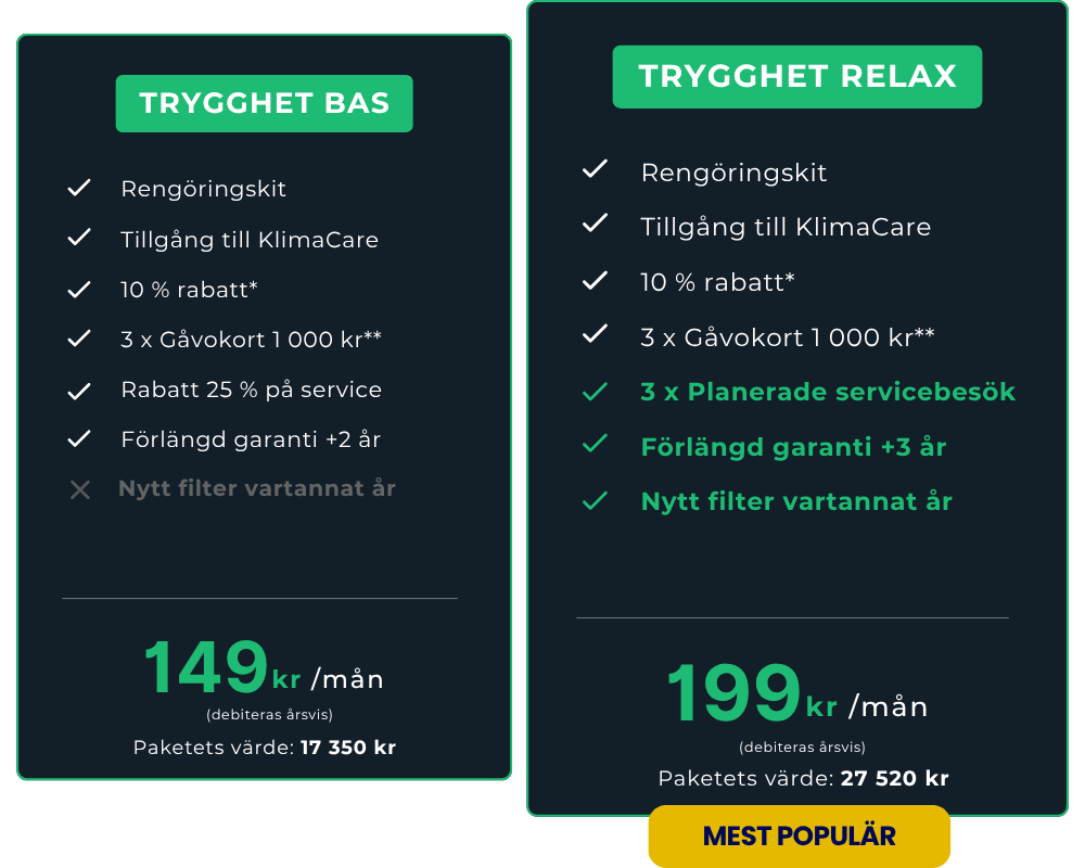För endast 199 kr i månaden är Trygghetspaket Relax vårt mest omfattande trygghetspaket, framtaget för dig som vill ha ett bekymmersfritt och långsiktigt ägande av din luftvärmepump med en inomhusdel. Paketet kombinerar service, garanti och praktiskt underhåll så att du slipper tänka på detaljerna. Vi påminner, skickar, bokar och följer upp så att du får trygg drift och maximal prestanda, året runt.